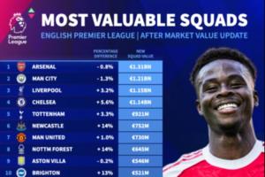 英超俱乐部身价排名:阿森纳、曼城下跌仍居前二,曼联遭纽卡超越