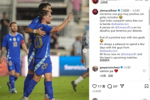 麦卡利斯特社媒晒出比赛照片,并写道:“以两粒进球结束了积极的国际比赛日之旅,与国家队伙伴们共度数日时光总是令人感到愉快。”